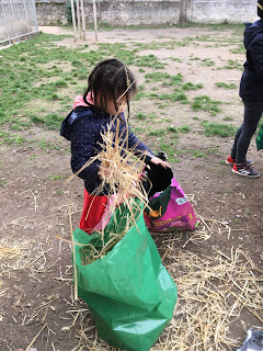Puis nous avons fait une chasse à la noisette comme Stratt (l’écureuil de l’âge de glace). Il fallait porter un œuf de dinosaure sans le faire tomber, « Sid, n’aie pas peur » il fallait mettre les mains dans des boites pour trouver un morceau de puzzle.