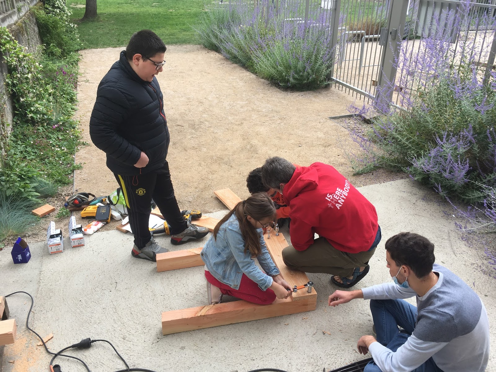 Construction de bacs de jardinage de différentes hauteurs avec le père Jean-Christophe