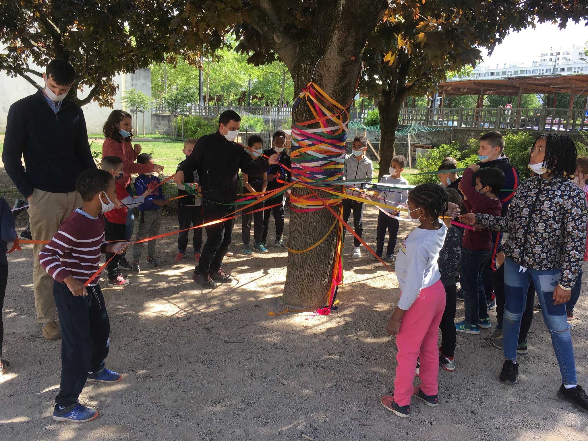 Une fois que les enfants avaient récupéré les rubans, nous avons commencé tous ensemble à faire l’arbre de mai. Chaque enfant avait un ruban de couleur. En s’entrecroisant, les enfants tissaient peu à peu sur un arbre de couleur. Cela symbolisait toutes les rencontres que l’on fait au cours de nos vies et les liens que nous tissons avec les autres.