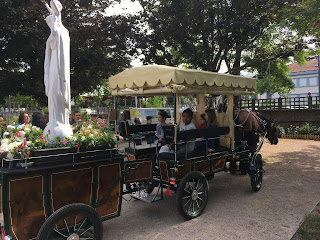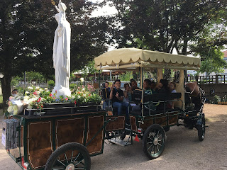 Une calèche tirée par Vladimir , un cheval d trait de 900 kg, qui est partie de la Salette et chemine sur les routes de France d’un sanctuaire marial à l’autre… Derrière la calèche, une grande statue de Notre Dame de France toute fleurie et une boite aux lettres pour y déposer des intentions de prière.